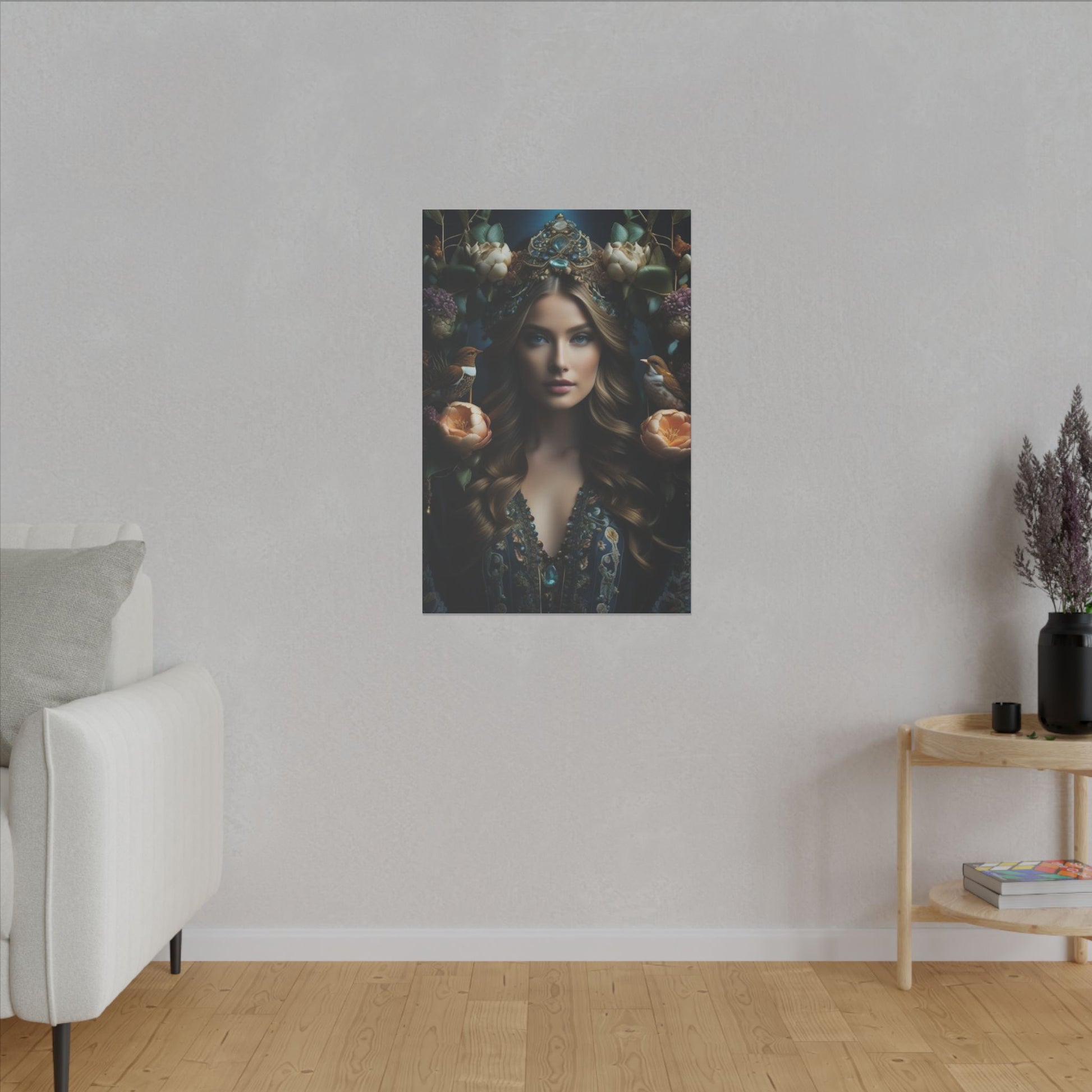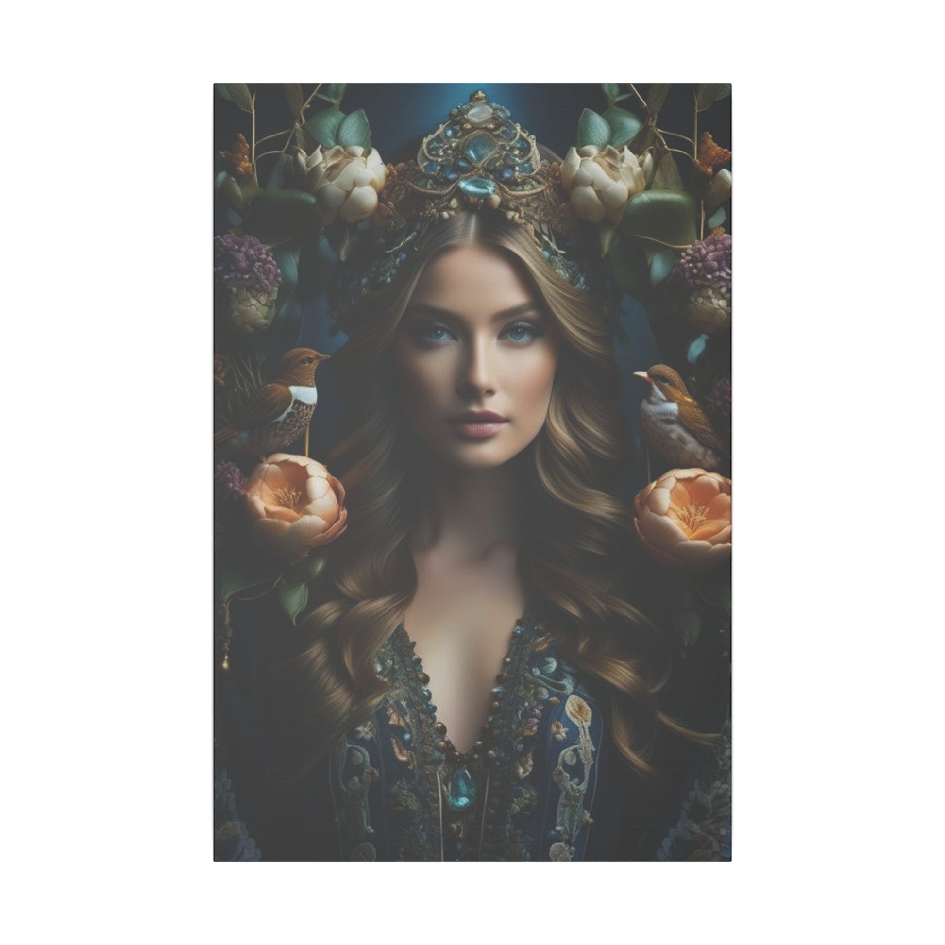 Step into a world of royal elegance with a custom queen portrait inspired by nature’s beauty and adorned with delicate flowers and birds. This masterpiece transforms you into a majestic ruler, exuding grace and sophistication.