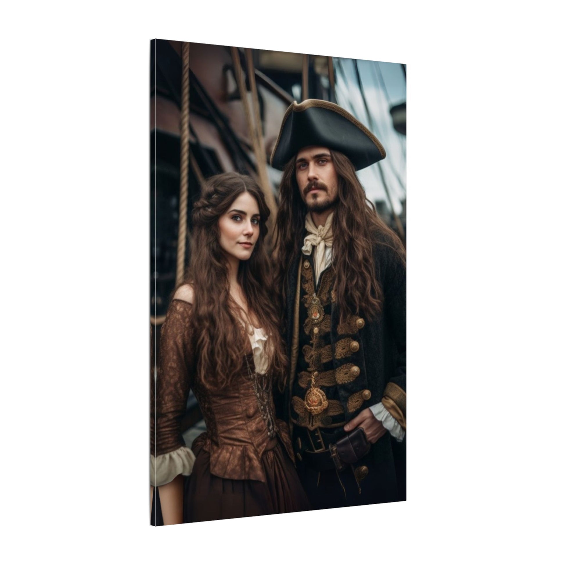 A cinematic pirate couple portrait aboard a classic ship, featuring detailed costumes, confident poses, and a romantic, adventurous vibe — perfect for personalized art gifts.