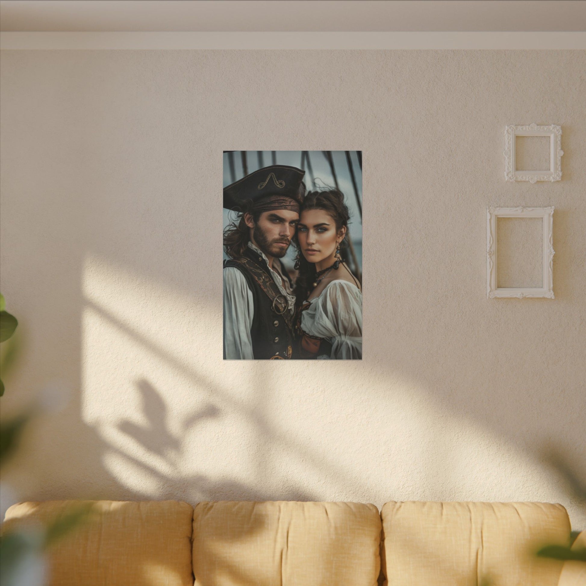 Capture the fiery bond of love and adventure with this stunning custom portrait of a bold pirate couple, radiating strength, romance, and timeless cinematic charm.